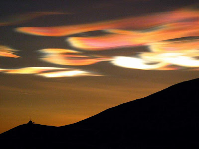 Nacreous are among the rarest of clouds, they are mostly visible two hours after sunset or before dawn when they shine brightly with vivid and slowly shifting iridescent colors. Compared with most lower altitude clouds, nacreous clouds stand almost still - an indicator of their great height (some 9 -16 miles high). Their brightness is because at those heights they are still sunlit. They can be found mostly at high latitudes like Scandinavia, Iceland, Alaska and Northern Canada. However, they do occur as far south as New England.